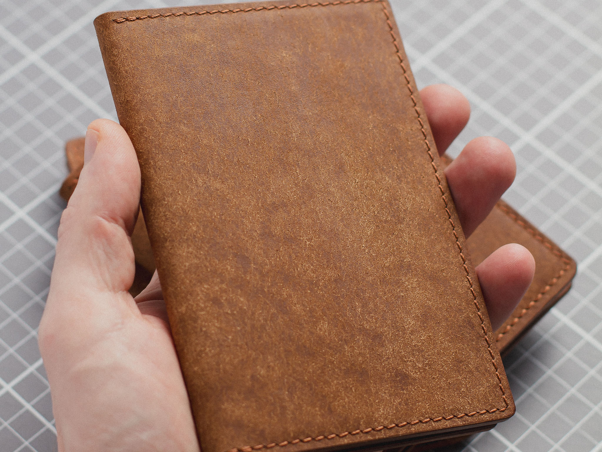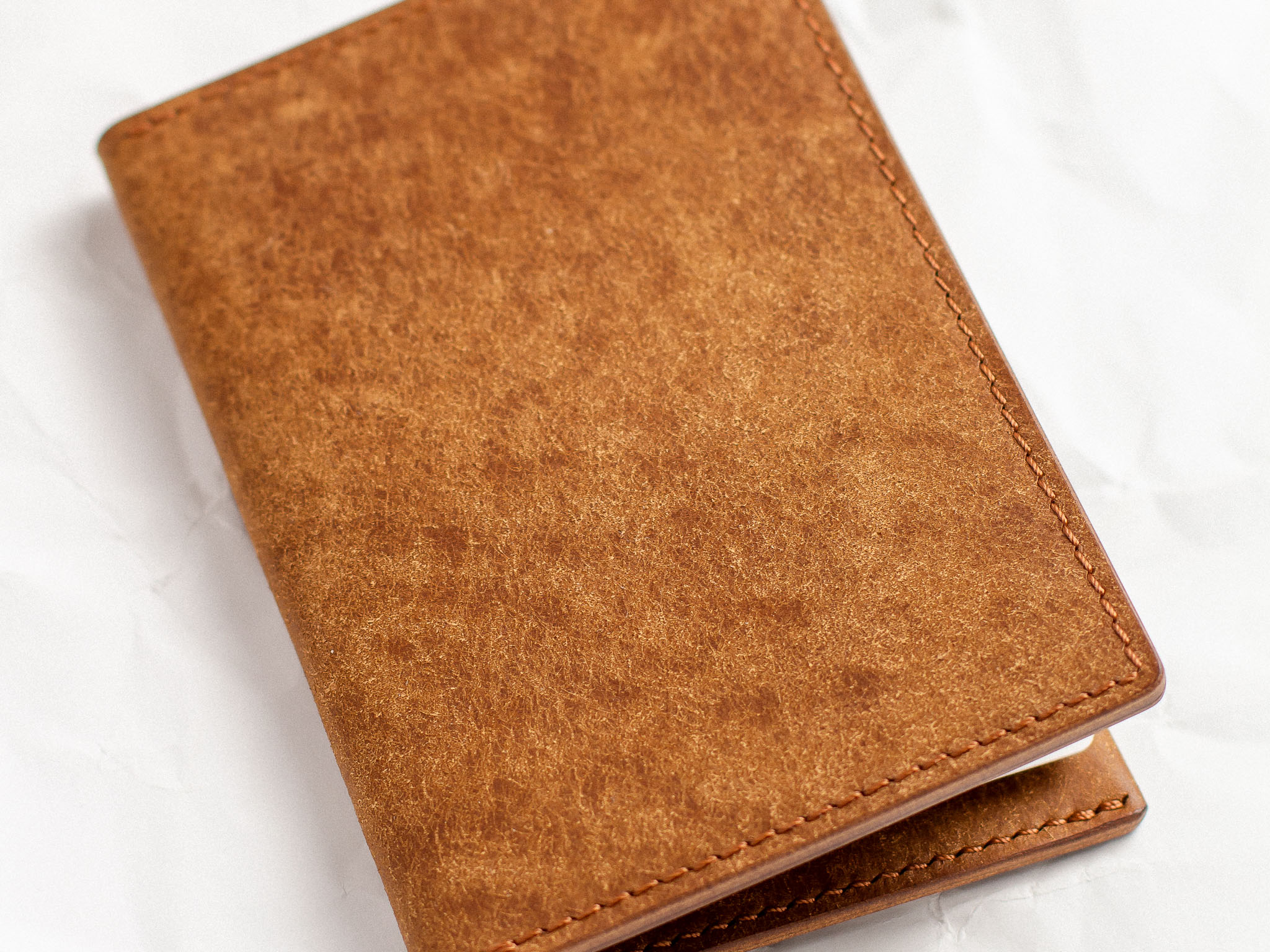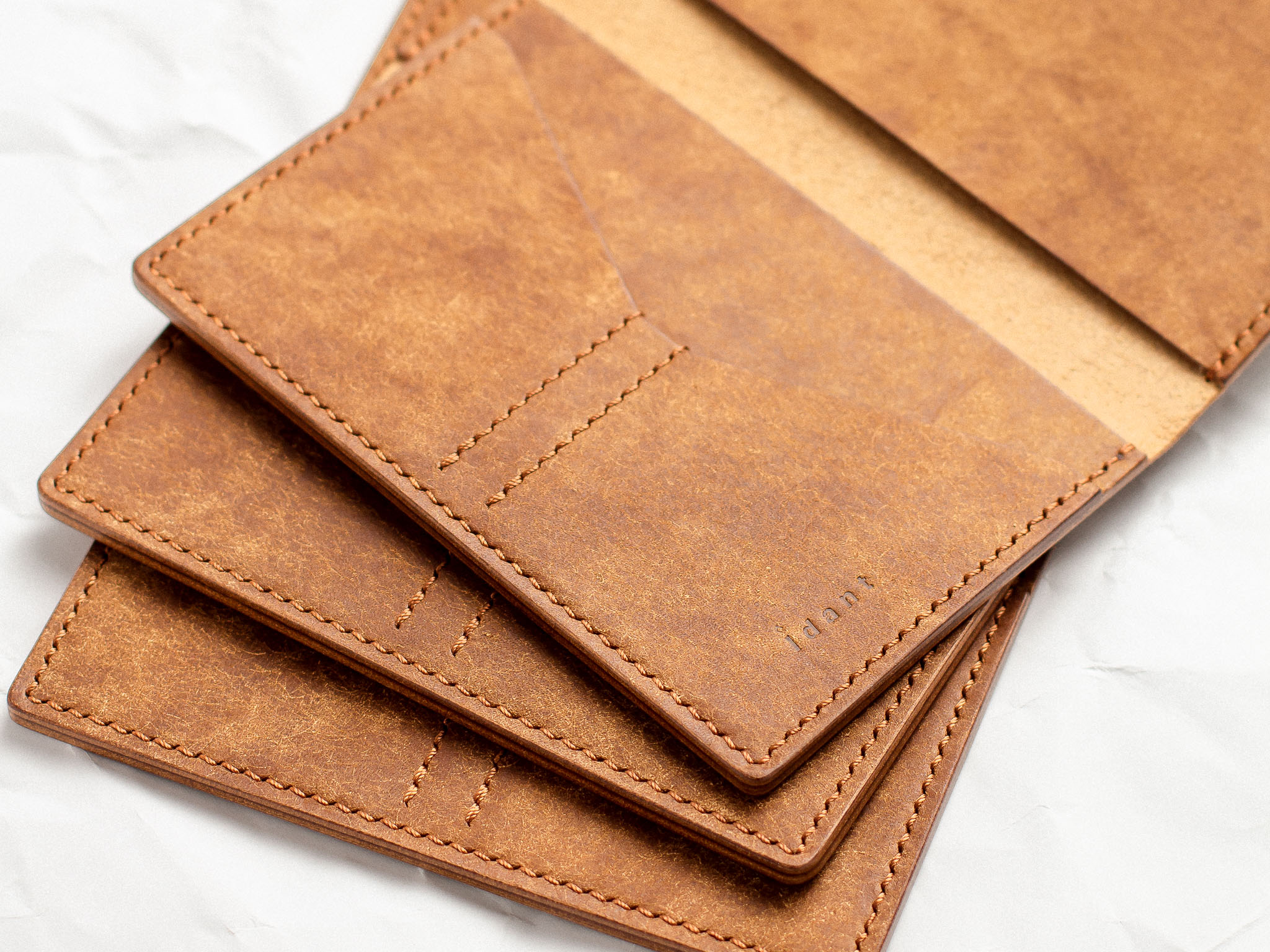 All our products are sewn entirely by hand using the traditional “saddle-stitch” method, a technique that machines cannot replicate. We use legendary threads like Ritza 25 and Vinymo MBT—both are thick, braided polyesters, waxed for extreme durability, and considered the gold standard for hand-sewing. This traditional process guarantees that the seams on your wallet will never unravel or come apart.